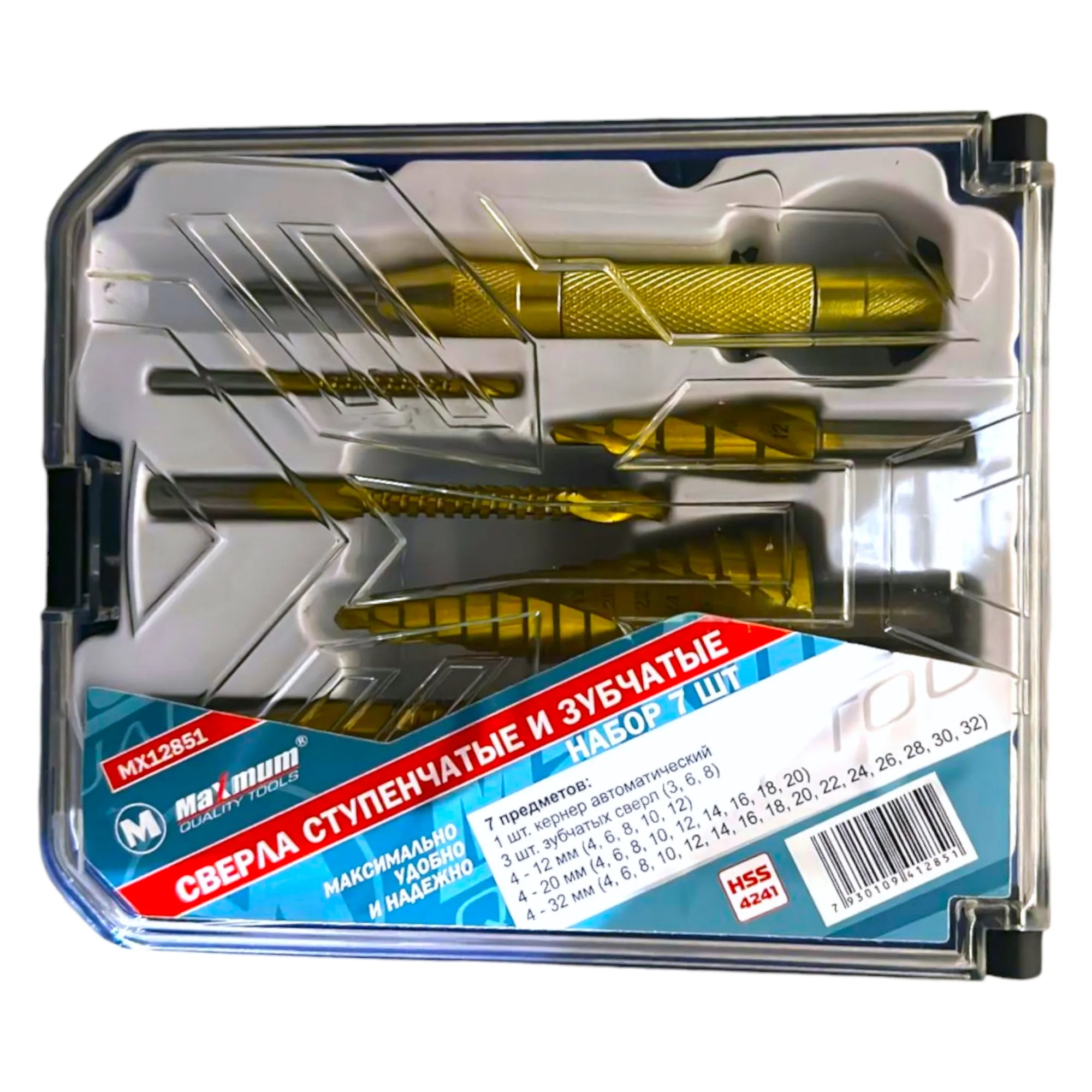 HSS сверла в данном наборе универсальны и различны по своему типу и назначению. Набор включает в себя три ступенчатых сверла, три сверла-фрезы и кернер.